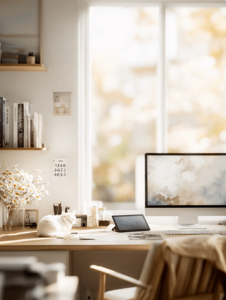 ANIMATION PROMPT: "A static shot of a desk in a feminine home office, designed for a creator to work. A white gauzy curtain from off screen on the right lazily moves into the room in the foreground as if lifted from a light breeze. A white cat on the desk turns its head. The overall mood is contemplative and serene a liminal space between productivity and daydreaming."